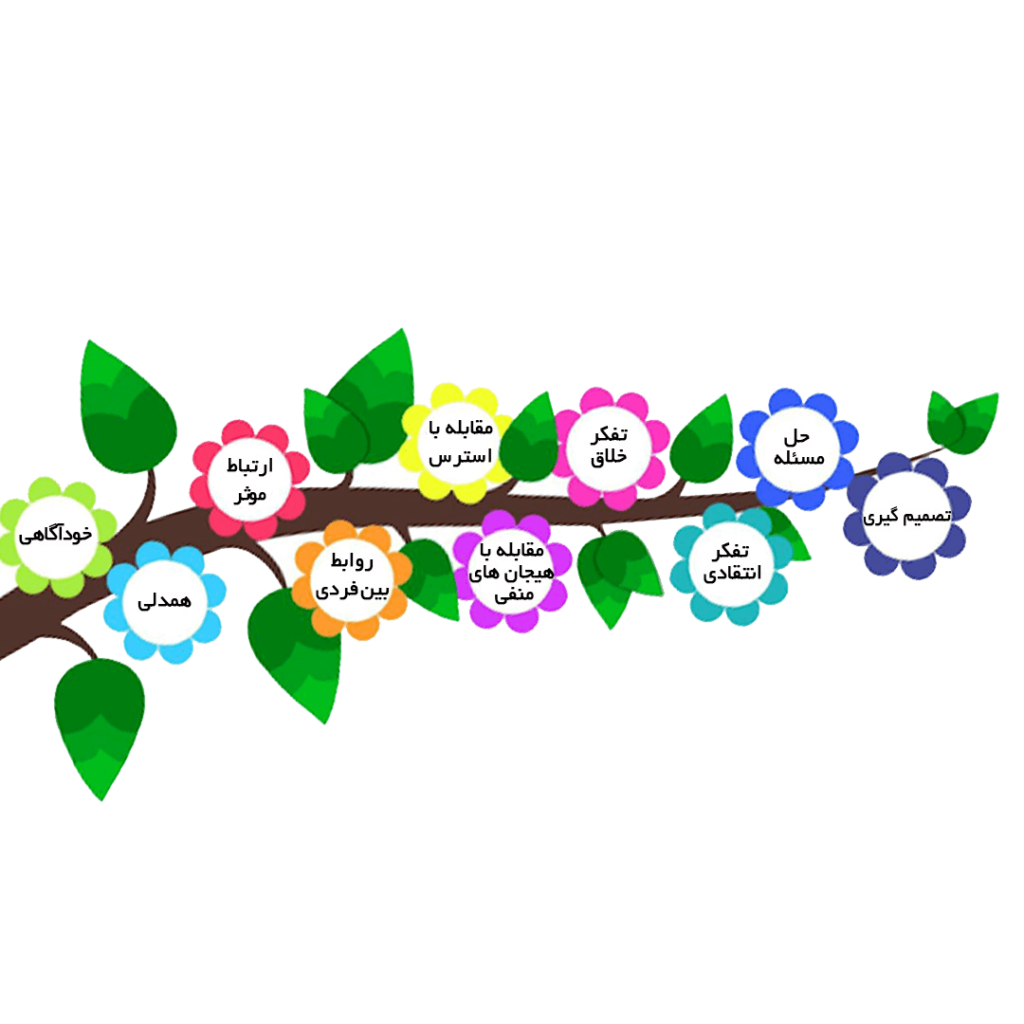 خودآگاهی، همدلی، ارتباط موثر، روابط بین فردی، مقابله با استرس، مقابله با هیجانهای منفی، تفکر خلاق، تفکر انتقادی، حل مسئله و تصمیمگیری.