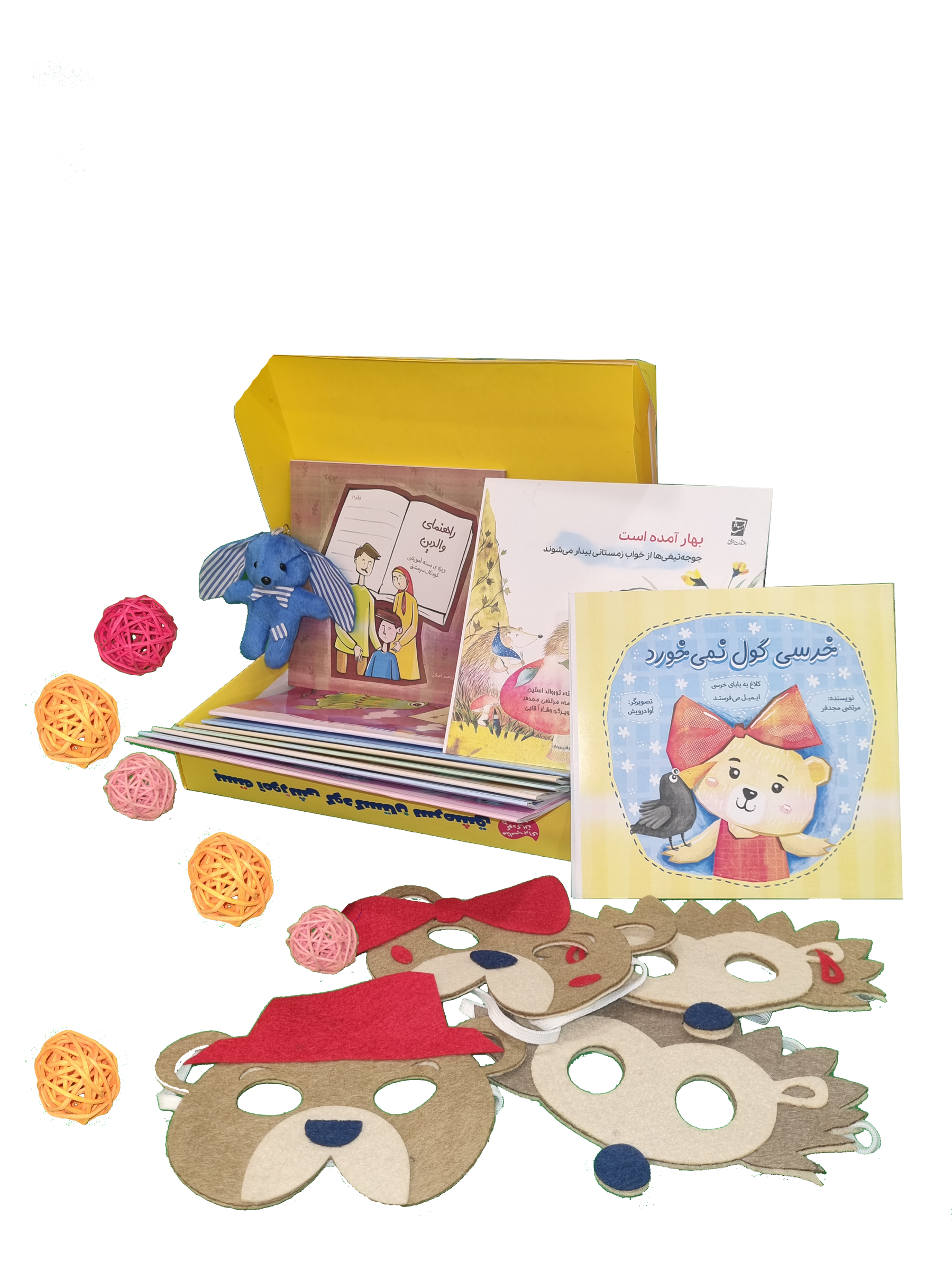 9 جلد کتاب کودک شامل مفاهیم علوم ، مفاهیم ریاضی و مهارتهای : حرکتی ، اجتماعی عاطفی، زیبایی شناختی و اخلاقی معنوی است که هر کدام از آنها یک جلد هستند و سه جلد زبان آموزی که شامل یک کتاب تمرین و دو جلد داستان در این بسته قرار دارد همچنین در این بسته چند ماسک نمایشی برای استفاده بهتر از دو کتاب مکمل داستانی قرار داده شده و یک کتاب کم حجم که به طور خلاصه استفاده از بسته را برای اولیا توضیح داده .